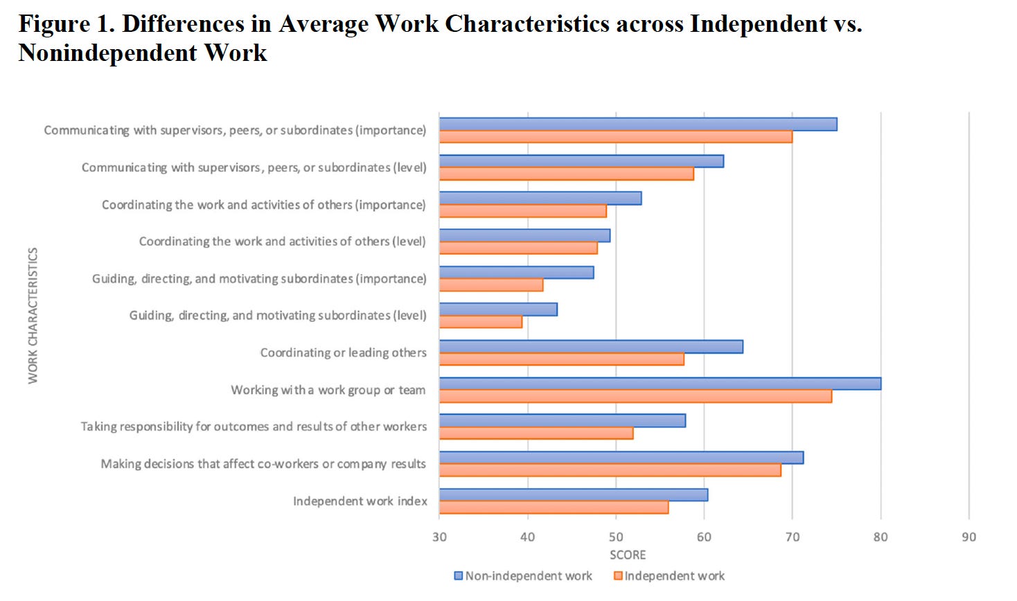 This connects directly to research I did with Paola Suarez, “Employee vs. Independent Worker: A Framework for Understanding Work Differences” (published by the Mercatus Center), examining how work characteristics differ between independent and traditional employment. We found that independent work relies significantly less on: